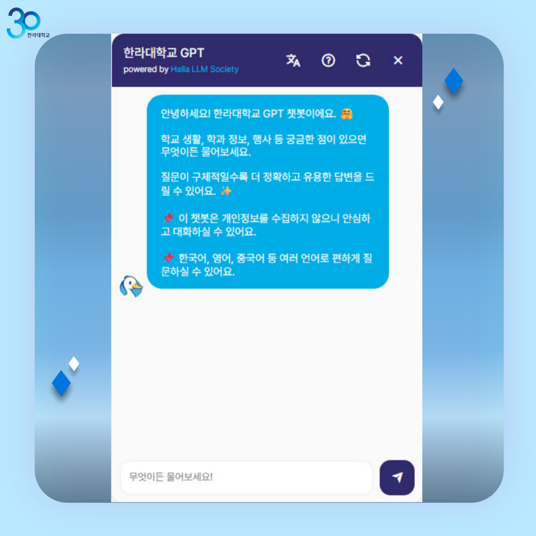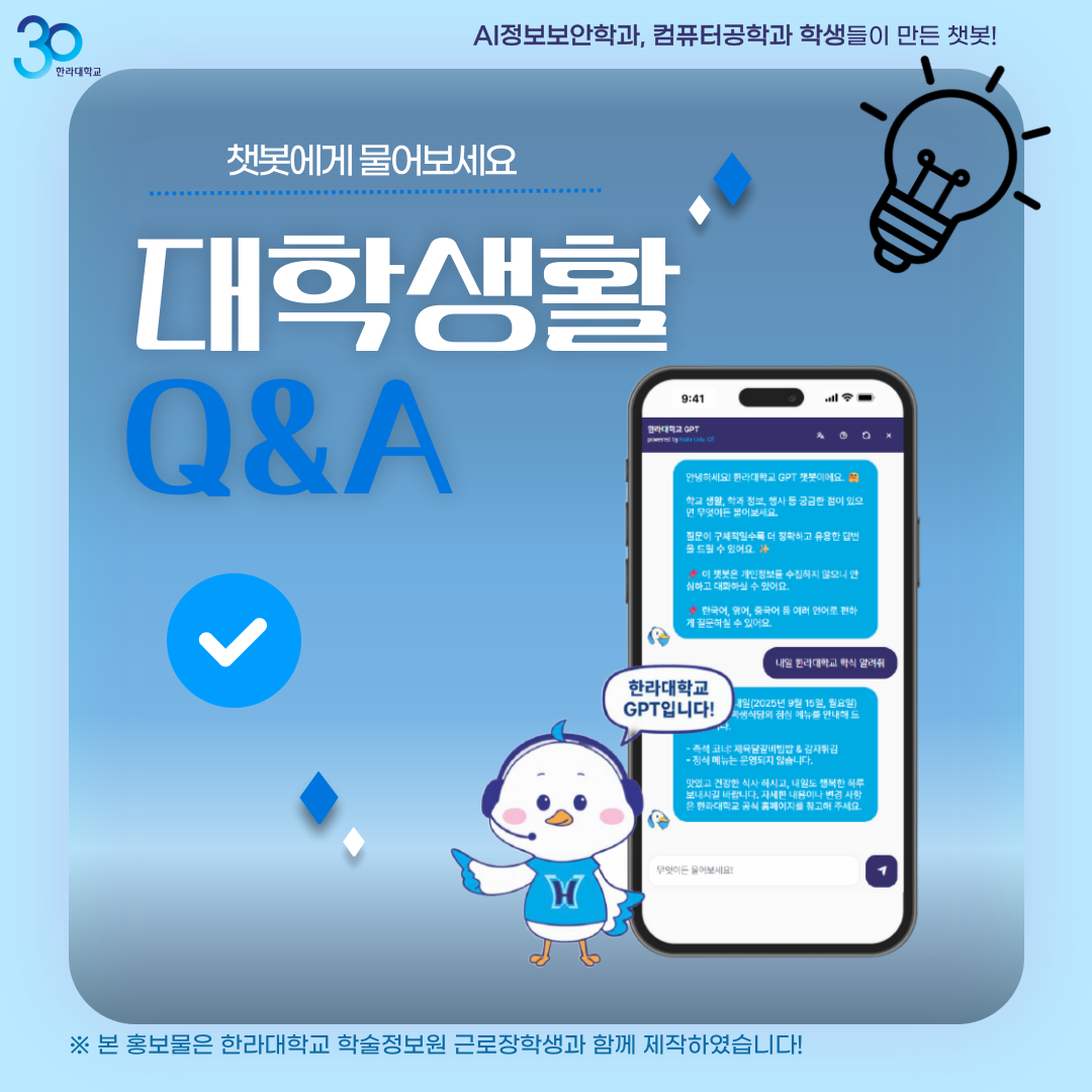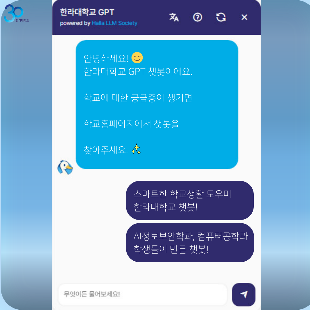 AI정보보안학과, 컴퓨터공학과 학생들이 만든 한라대학교 챗봇을 오픈합니다.