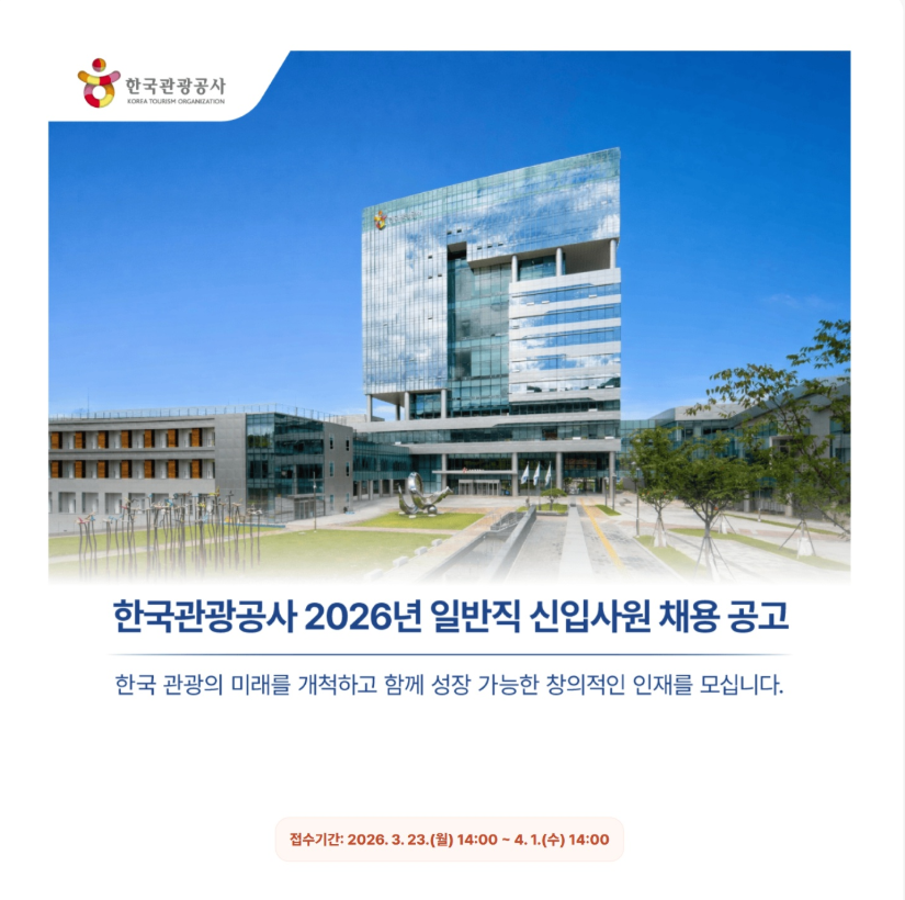 한국관광공사에서 2026년 일반직 신입사원 채용을 하니, 관심있으신 재학생 그리고 졸업생분들은 참고 부탁드립니다. 감사합니다